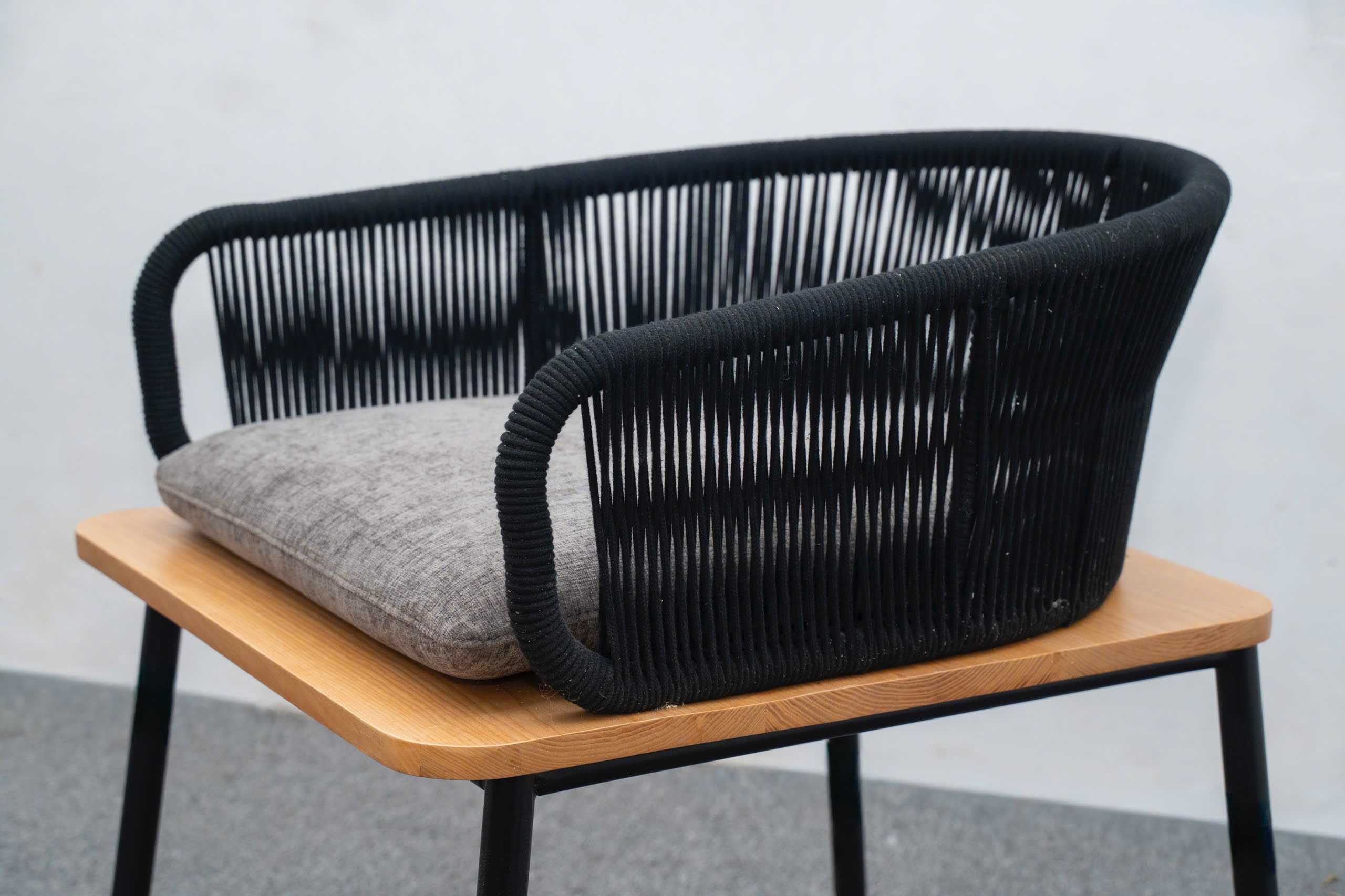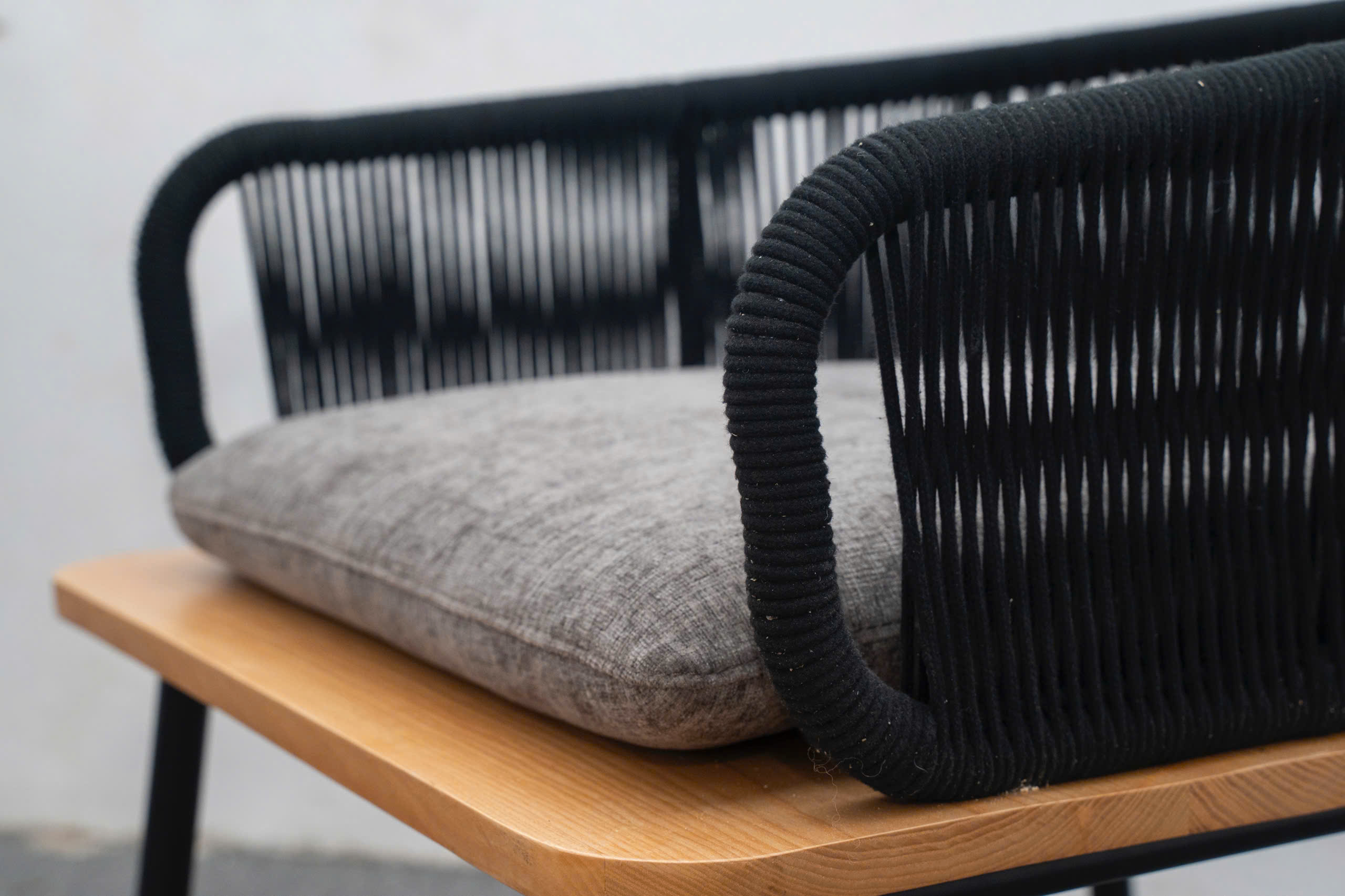 Điểm nhấn đắt giá nhất, thu hút mọi ánh nhìn ngay từ lần đầu tiên chính là phần tựa lưng và tay vịn được tạo hình hoàn toàn từ những sợi dây thừng đen cao cấp. Tại xưởng SofaZ, các nghệ nhân đã dành hàng giờ đồng hồ để đan cài thủ công từng sợi dây đều tặn, tạo nên một hệ thống mạng lưới sọc đứng vô cùng ấn tượng. Kỹ thuật đan dây này yêu cầu người thợ phải có lực tay cực kỳ đều và sự kiên nhẫn cao độ để đảm bảo các khoảng cách dây luôn chính xác, không bị xô lệch hay lỏng lẻo sau thời gian dài sử dụng.