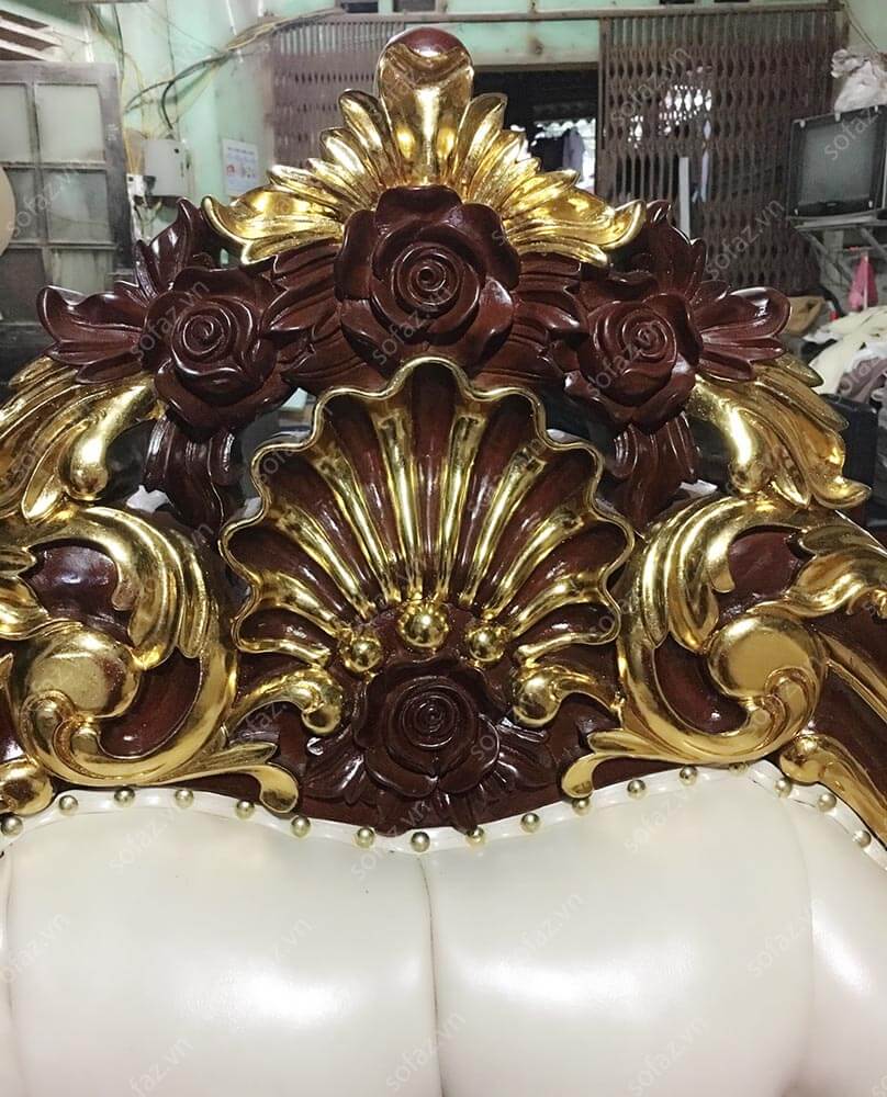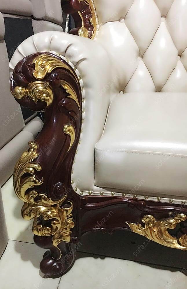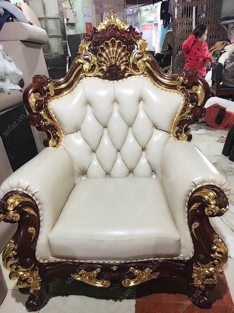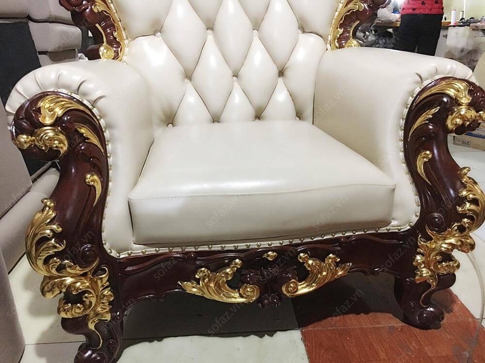 Ảnh chụp bộ ghế sofa Tân cổ điển da cao cấp của anh Linh - Mỹ Đình tại xưởng SofaZ (do cuối năm lượng hàng nhiều không chụp đầy đủ cả bộ sofa 1-1-3, bài viết chỉ cung cấp ảnh sản phẩm đang sản xuất). Bộ sofa Tân cổ điển AT16 bọc da cao cấp với kiểu dáng Tân cổ điển sang trọng, tinh tế. Bộ sofa  AT16 gồm 1 sofa đơn + 1 sofa văng 2 chỗ ngồi + 1 sofa văng 3 chỗ ngồi được rút quả trám công nghệ mới nhất, đệm rời sang trọng cùng màu trắng tinh tế. Khung gỗ tự nhiên cao cấp được mạ vàng cùng đinh đồng thể hiện đẳng cấp bộ sofa.