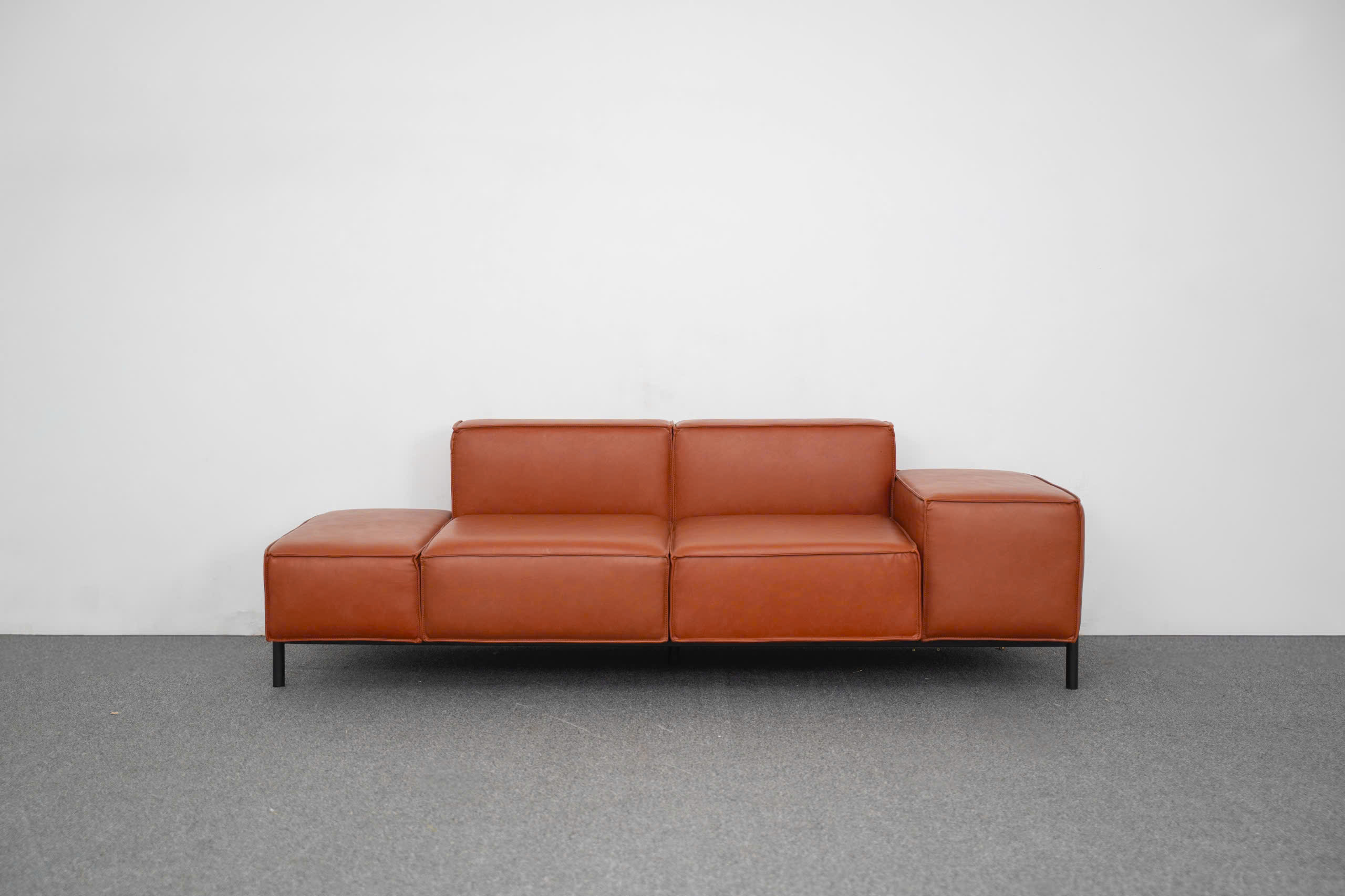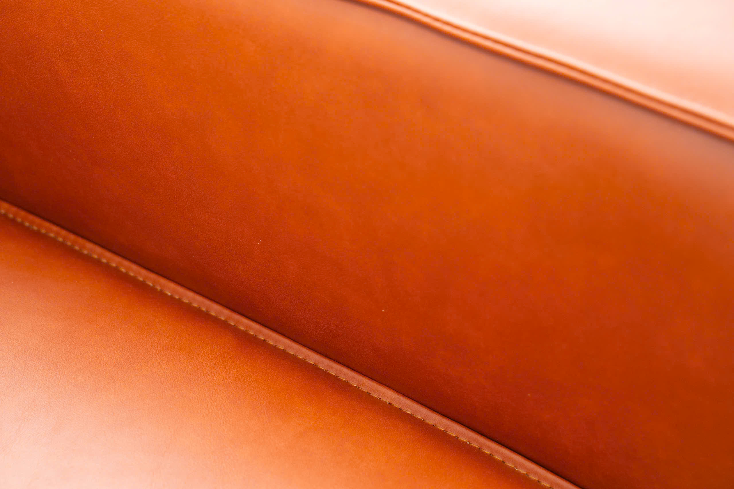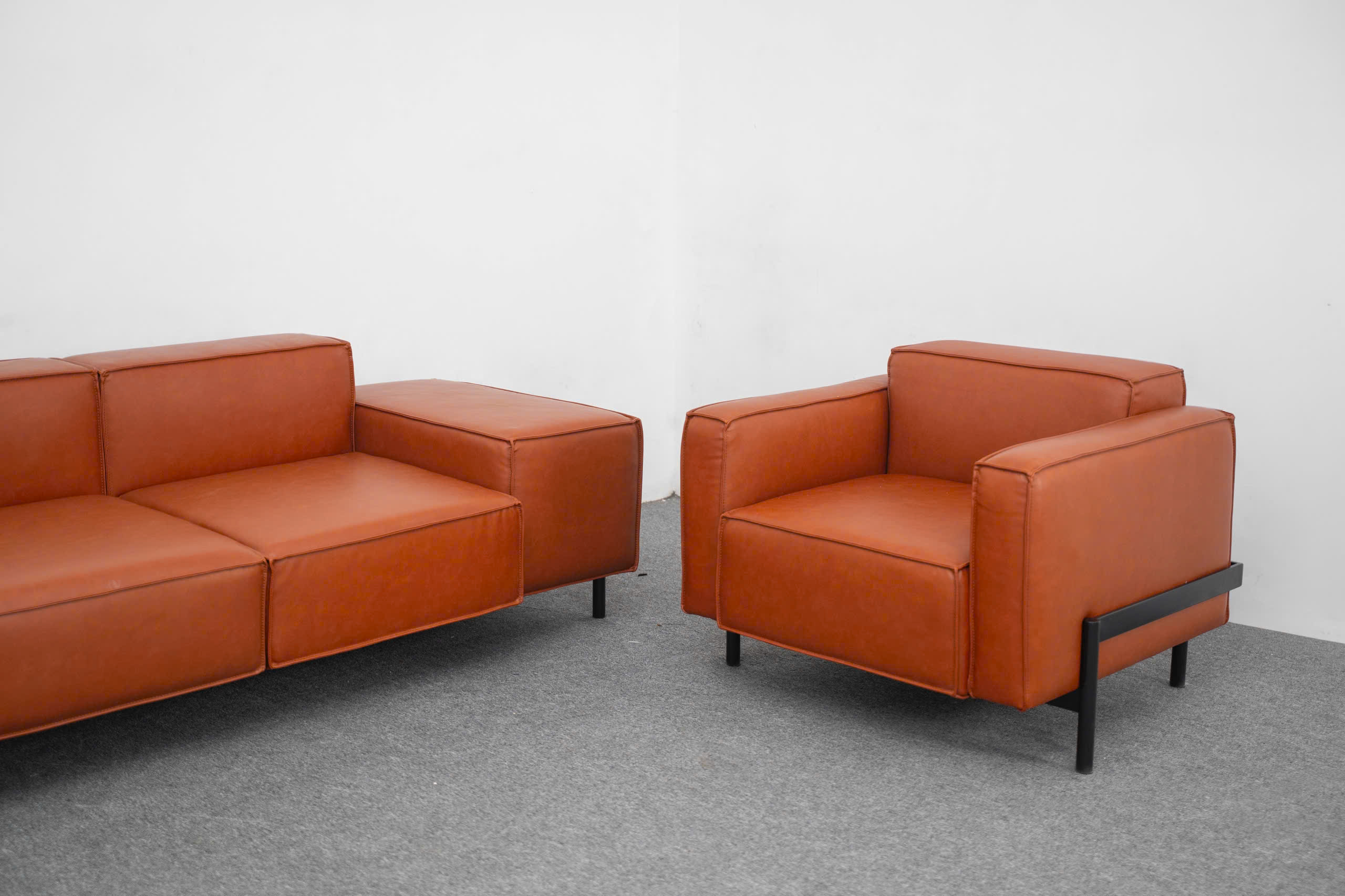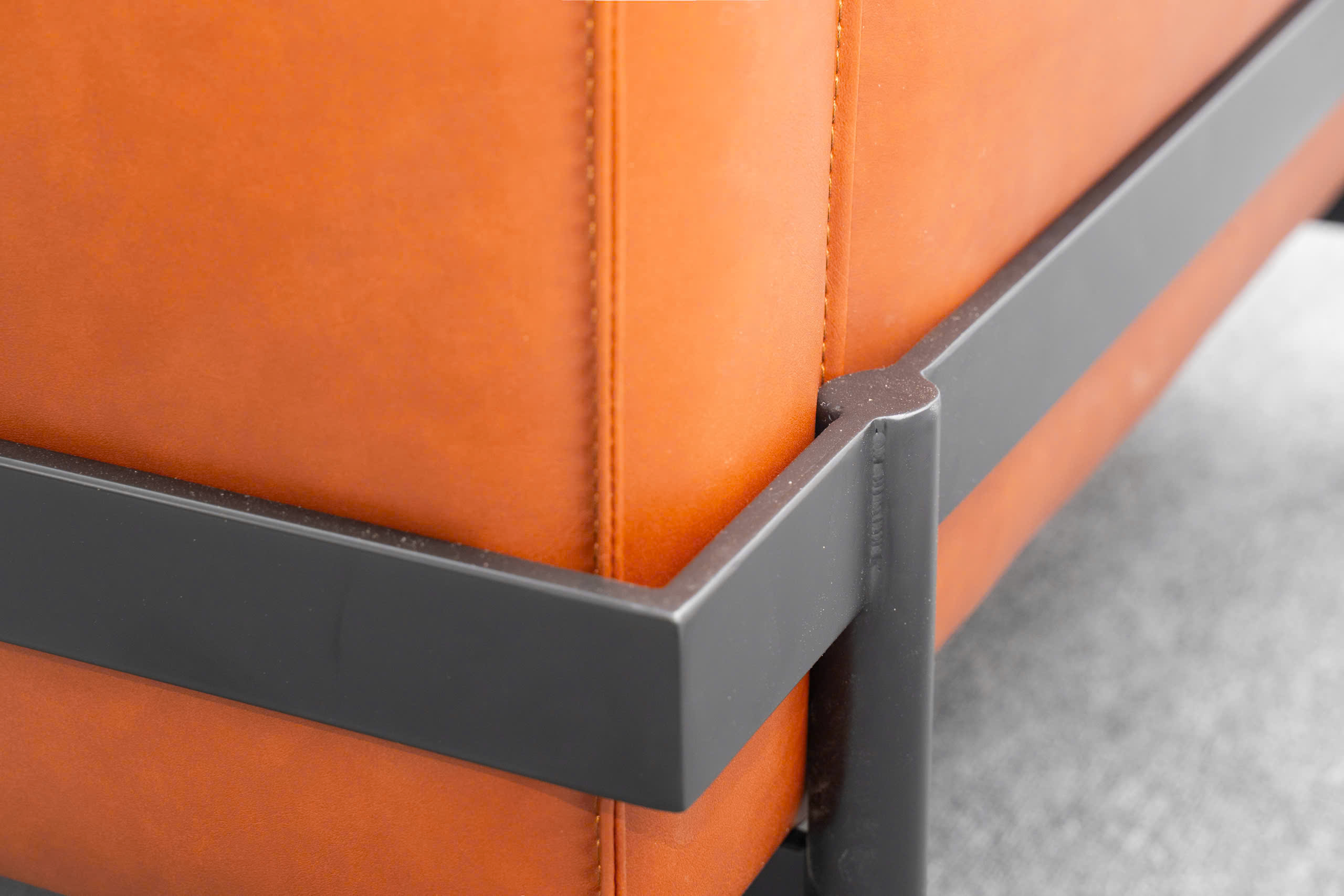 Bao bọc bên trong hệ khung thép đen lạnh lùng là lớp nệm dày dặn, được chế tác từ những lớp mút định hình đa tầng chống lún xẹp, bọc ngoài bởi chất liệu da cao cấp mang tông màu cam đất (Terra). Sự kết hợp giữa tông màu đen mờ và màu cam đất tạo nên một hiệu ứng tương phản thị giác cực kỳ sang trọng. Màu cam đất không chỉ mang lại hơi ấm cho căn phòng mà còn gợi lên cảm giác về sự sang trọng, quyền quý nhưng vẫn rất gần gũi với thiên nhiên.