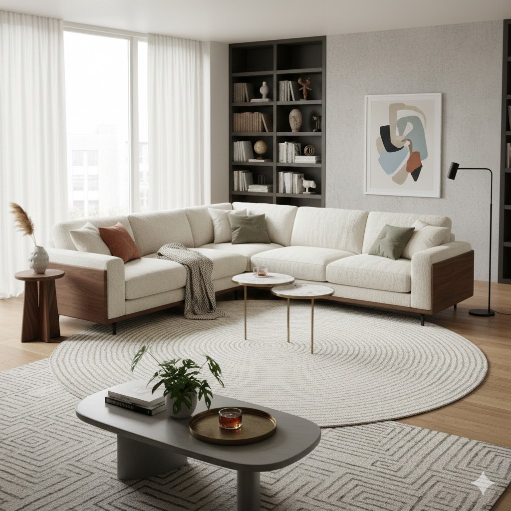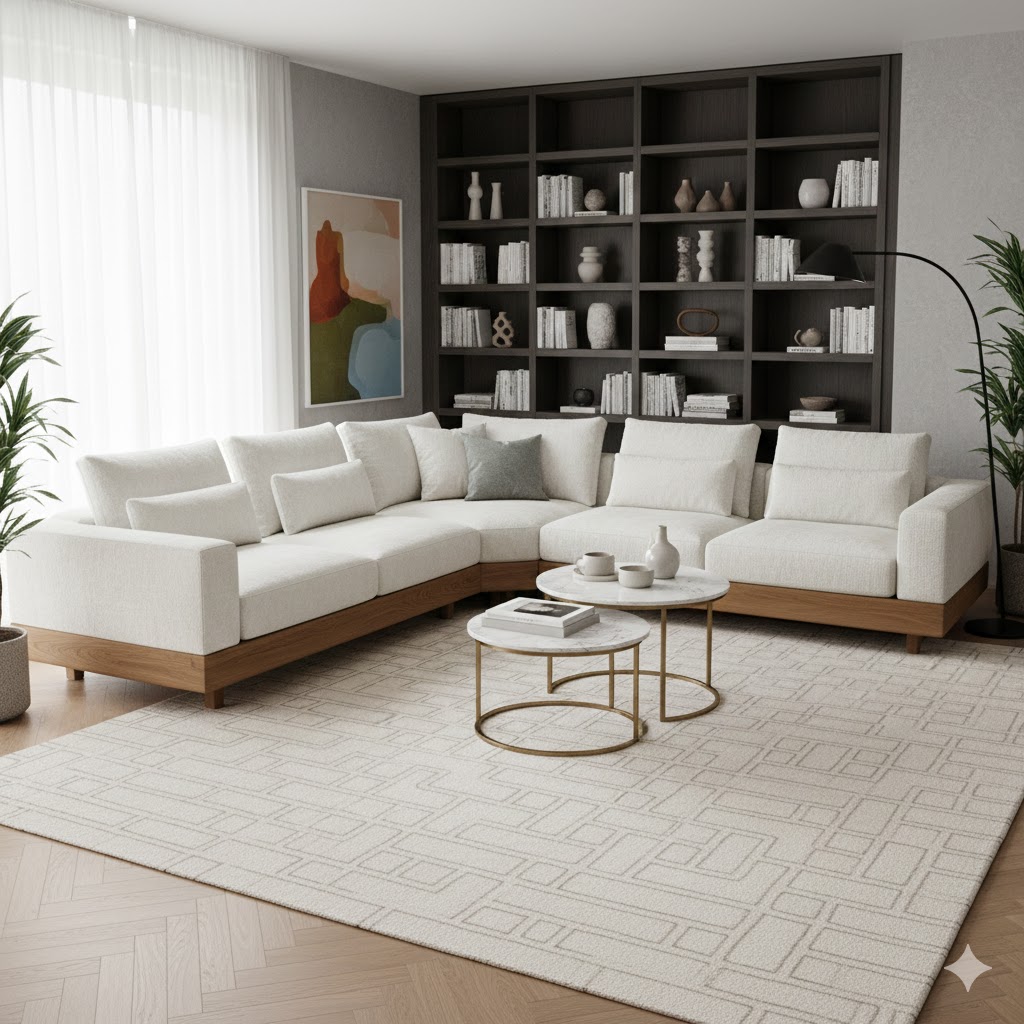 Các loại gỗ sáng màu như Sồi (Oak) hoặc Tần Bì (Ash) sẽ được dùng để chế tác bàn, tủ. Hoặc ngược lại, các chi tiết gỗ nâu đậm (như Óc Chó) sẽ tạo ra điểm tương phản sắc nét, làm nổi bật sự sang trọng của chiếc sofa trắng mây.