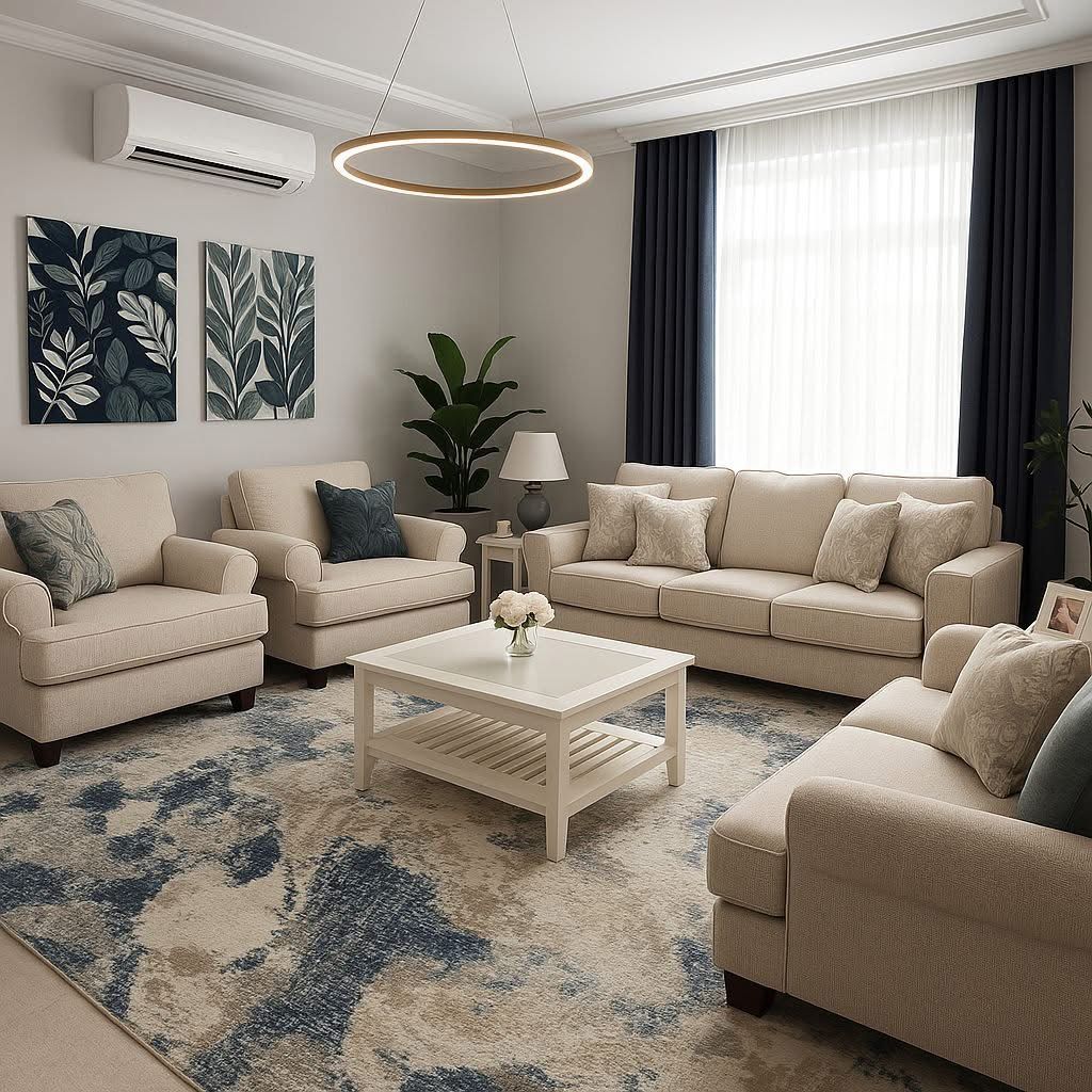 Đặt một chiếc thảm lớn dưới khu vực sofa, ưu tiên tông màu Xám Đậm hoặc Xanh Navy đậm, có họa tiết hình học tối giản. Màu tối của thảm sẽ neo giữ toàn bộ không gian, làm nền hoàn hảo cho sofa màu sáng và các phụ kiện trắng – bạc nổi bật.