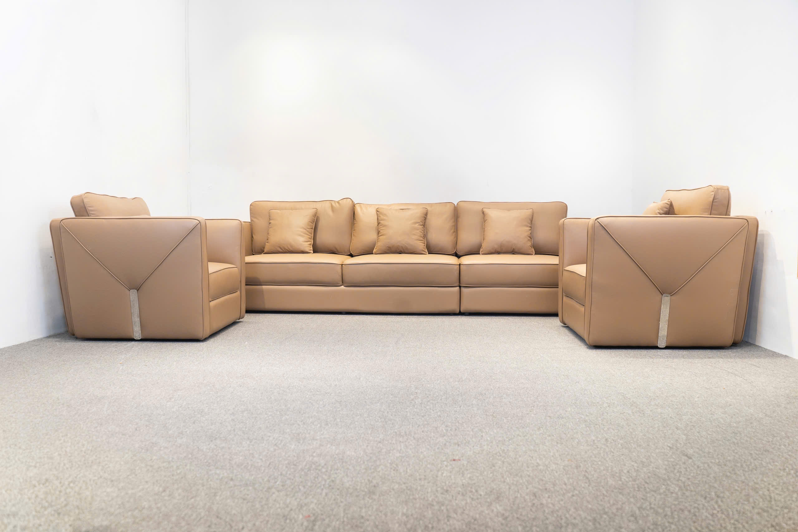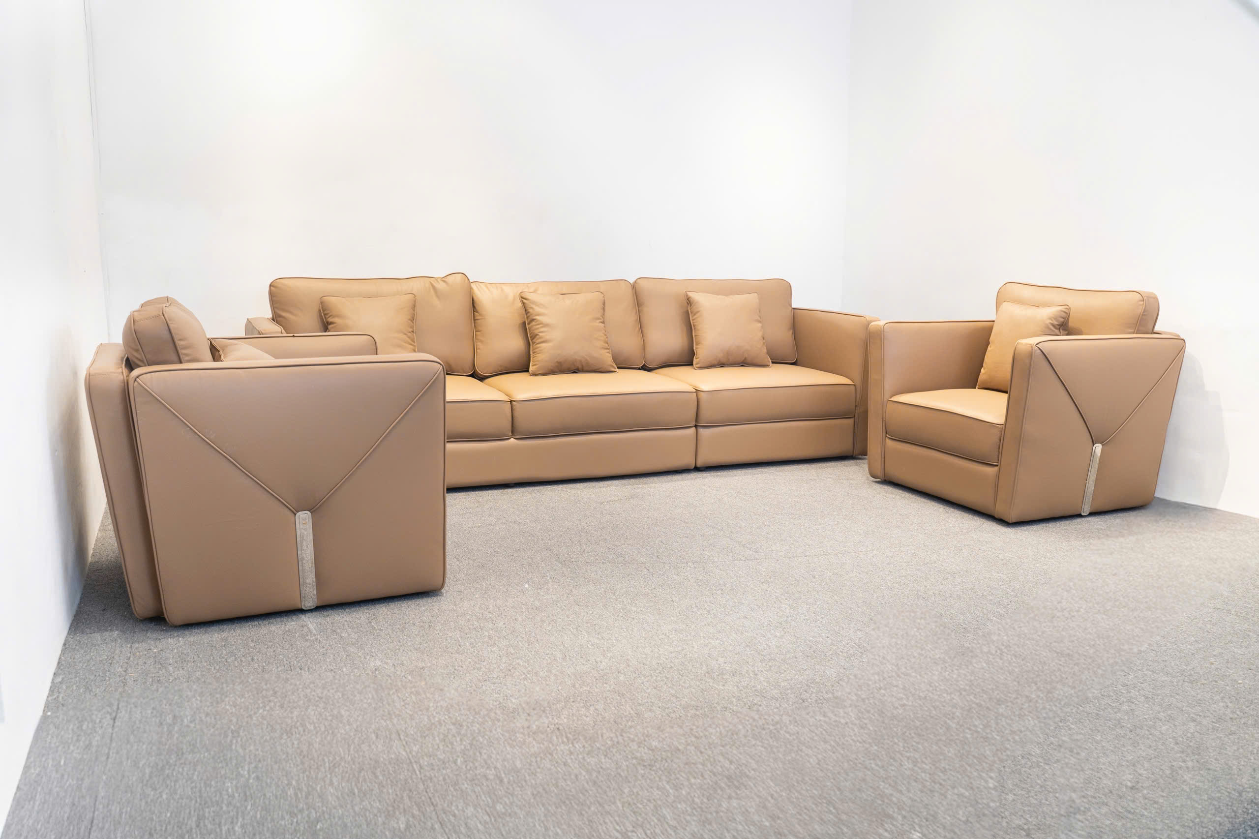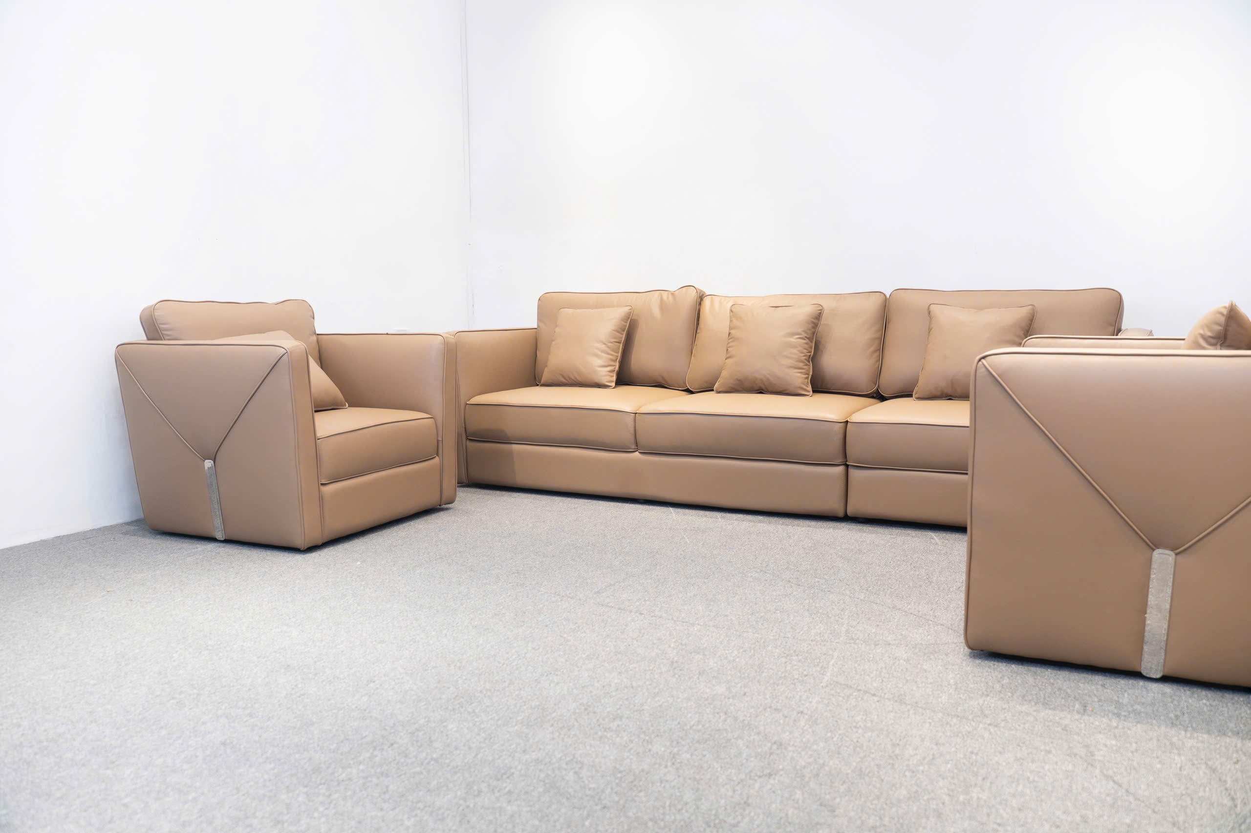 Điểm nhấn thị giác mạnh mẽ trên bộ sofa là các đường may tinh xảo chạy dọc các mép nối và các chi tiết may hình học đặc trưng (có thể là hình tam giác hoặc chữ V ngược) ở mặt ngoài tay vịn hoặc lưng ghế. Những đường may này thể hiện tay nghề cao của xưởng sản xuất sofa và nâng tầm sản phẩm thành một tác phẩm nghệ thuật, khẳng định chất lượng sofa tân xưởng.