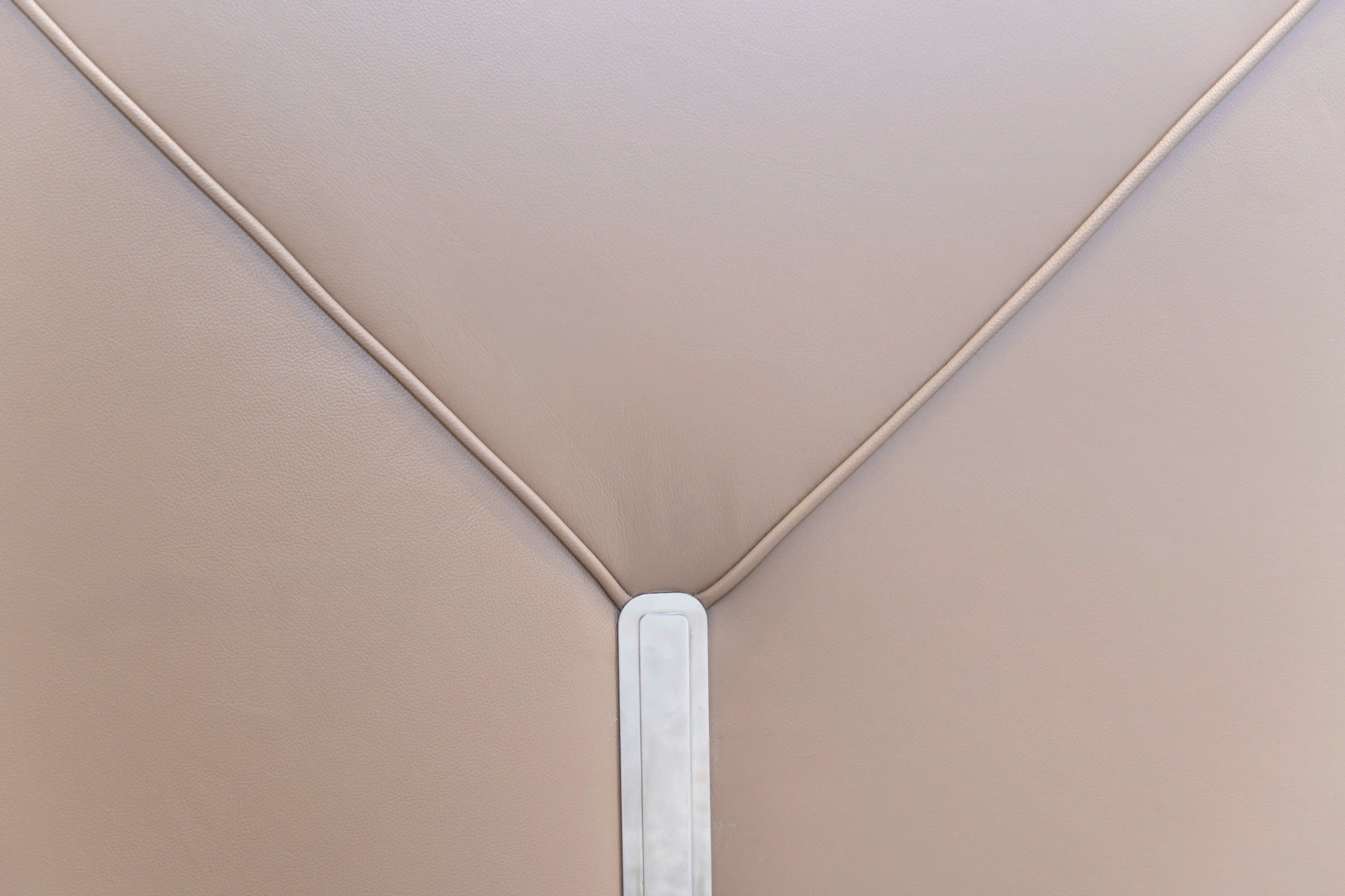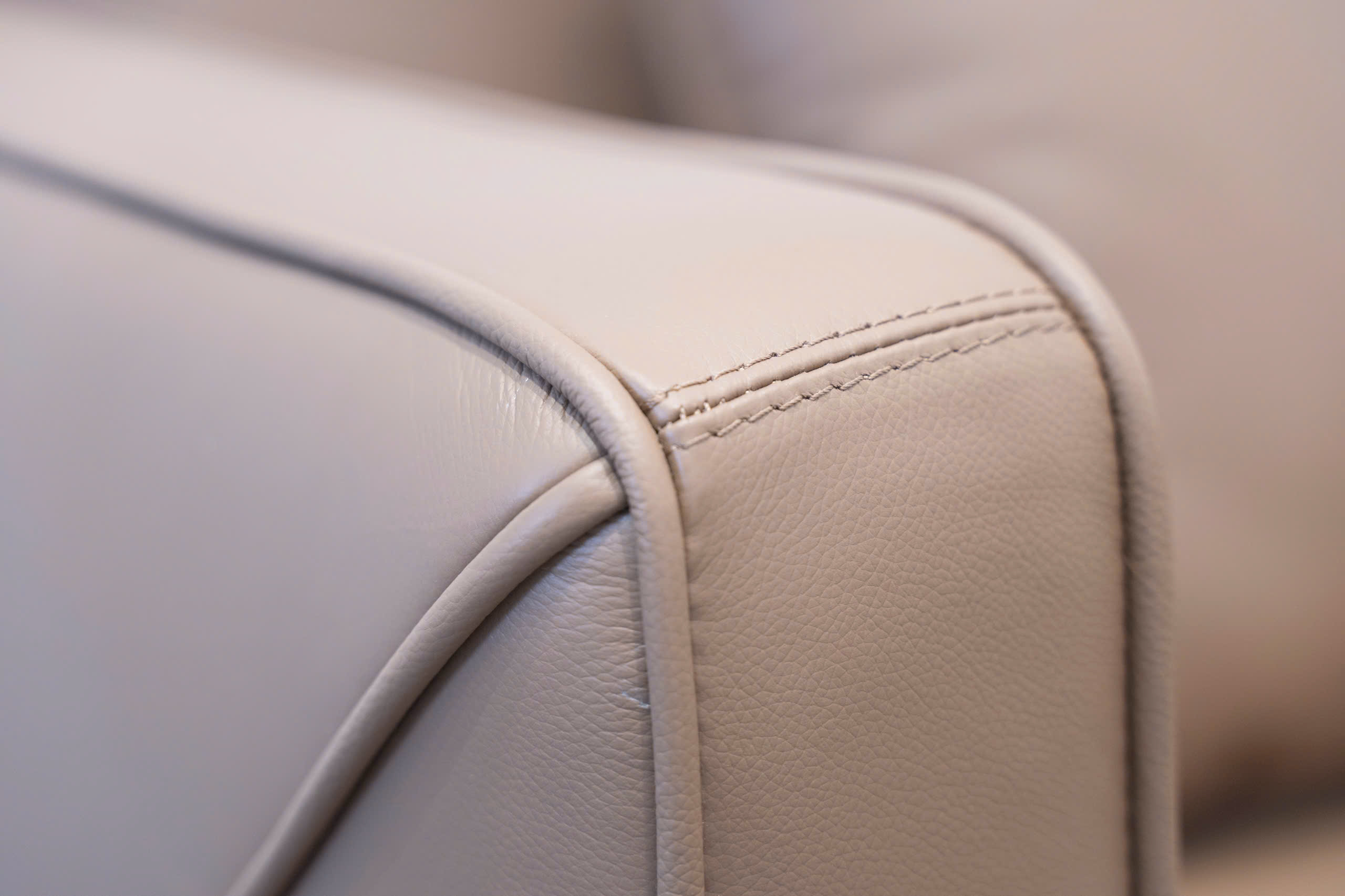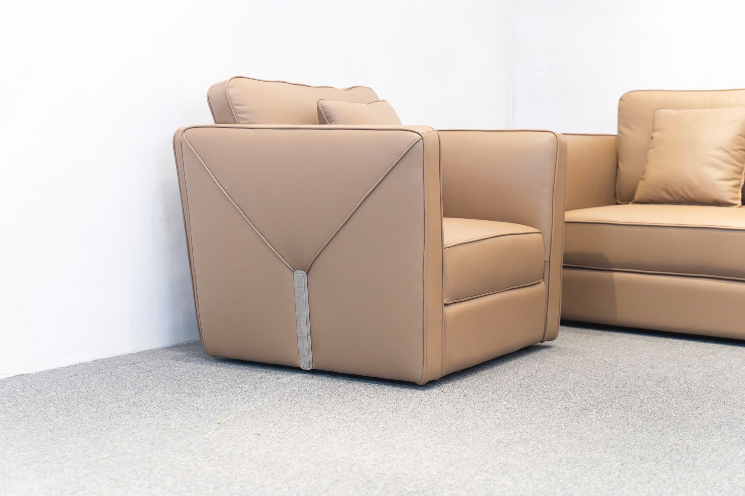 Điểm nhấn thị giác mạnh mẽ trên bộ sofa là các đường may tinh xảo chạy dọc các mép nối và các chi tiết may hình học đặc trưng (có thể là hình tam giác hoặc chữ V ngược) ở mặt ngoài tay vịn hoặc lưng ghế. Những đường may này thể hiện tay nghề cao của xưởng sản xuất sofa và nâng tầm sản phẩm thành một tác phẩm nghệ thuật, khẳng định chất lượng sofa tân xưởng.