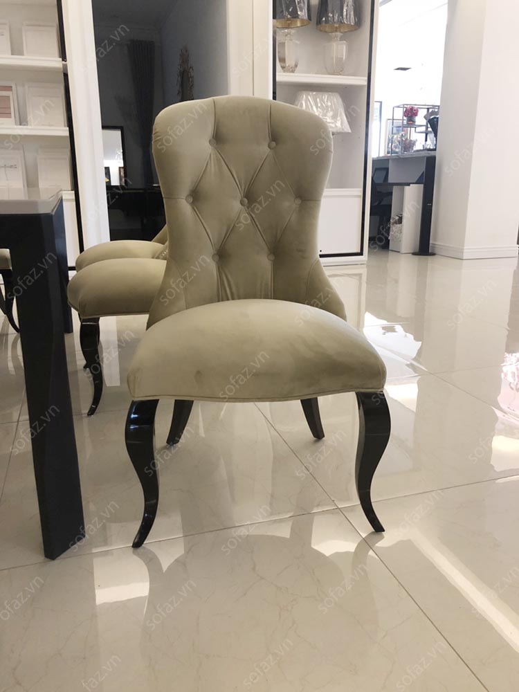 Mẫu ghế bàn ăn cao cấp luxury AT02 bọc nỉ Bỉ nhập khẩu với kiểu dáng Tân cổ điển sang trọng, tinh tế. Ghế bàn ăn AT02 với màu kem sang trọng, điểm nhấn đinh đồng và rút nút quả trám sang trọng và tinh tế.