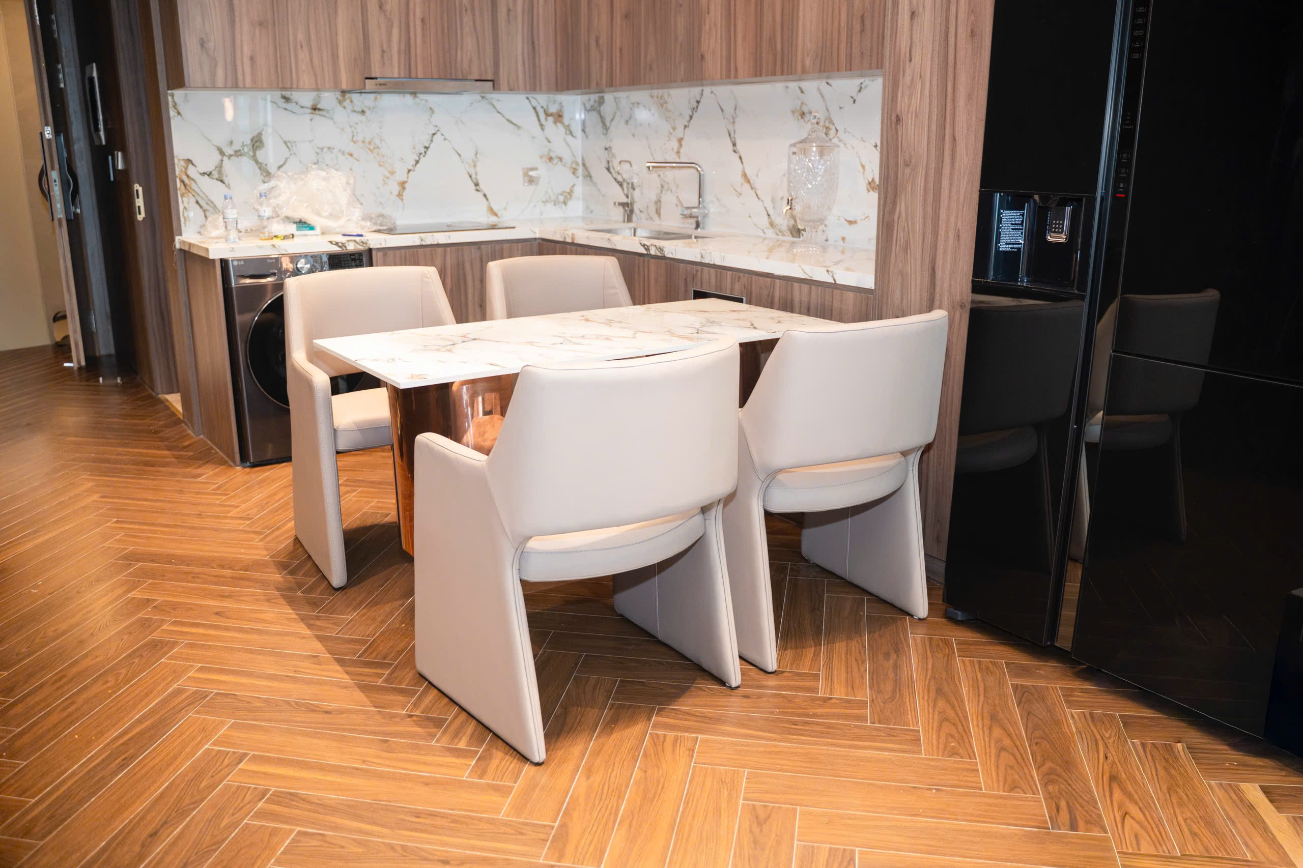 Mẫu ghế ăn này sinh ra để dành cho những không gian được đầu tư bài bản về chất liệu. Trong những căn hộ có sàn gỗ óc chó lát kiểu xương cá hay những mảng tường ốp đá Marble quý hiếm, sắc kem của ghế đóng vai trò là "điểm sáng" cân bằng lại màu trầm của gỗ và đá.