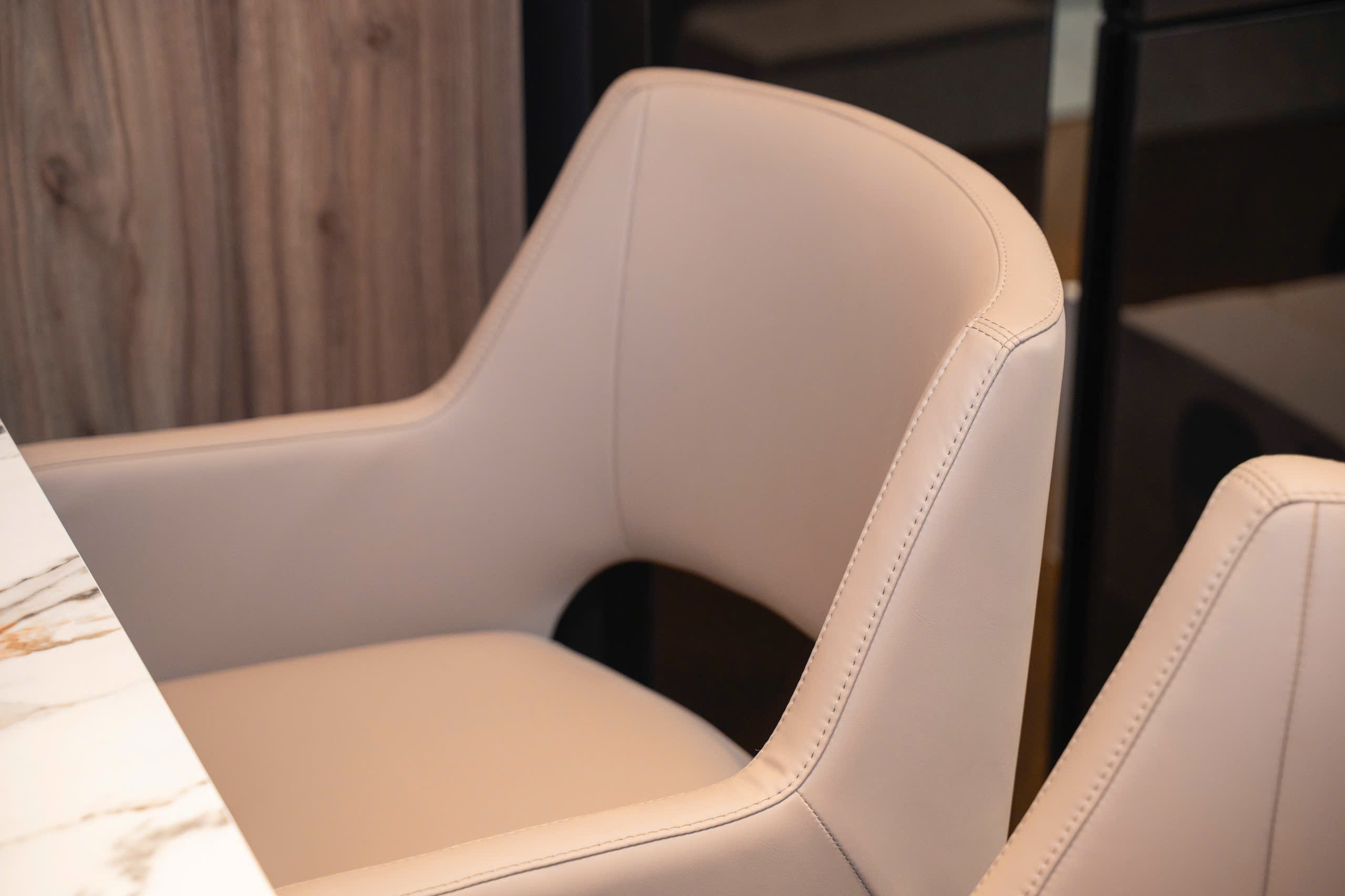 Đẳng cấp của một món đồ nội thất Luxury nằm ở cảm giác khi chạm vào. Toàn bộ bề mặt ghế được bao phủ bởi dòng da với tiêu chuẩn cao cấp nhất. Lớp da màu trắng kem không chỉ mang lại vẻ đẹp trang nhã, rạng rỡ cho căn phòng mà còn sở hữu những ưu điểm vượt trội về độ bền. Bề mặt da mịn màng, có khả năng kháng khuẩn, chống bám bẩn và dễ dàng vệ sinh – một yếu tố then chốt cho không gian phòng ăn.