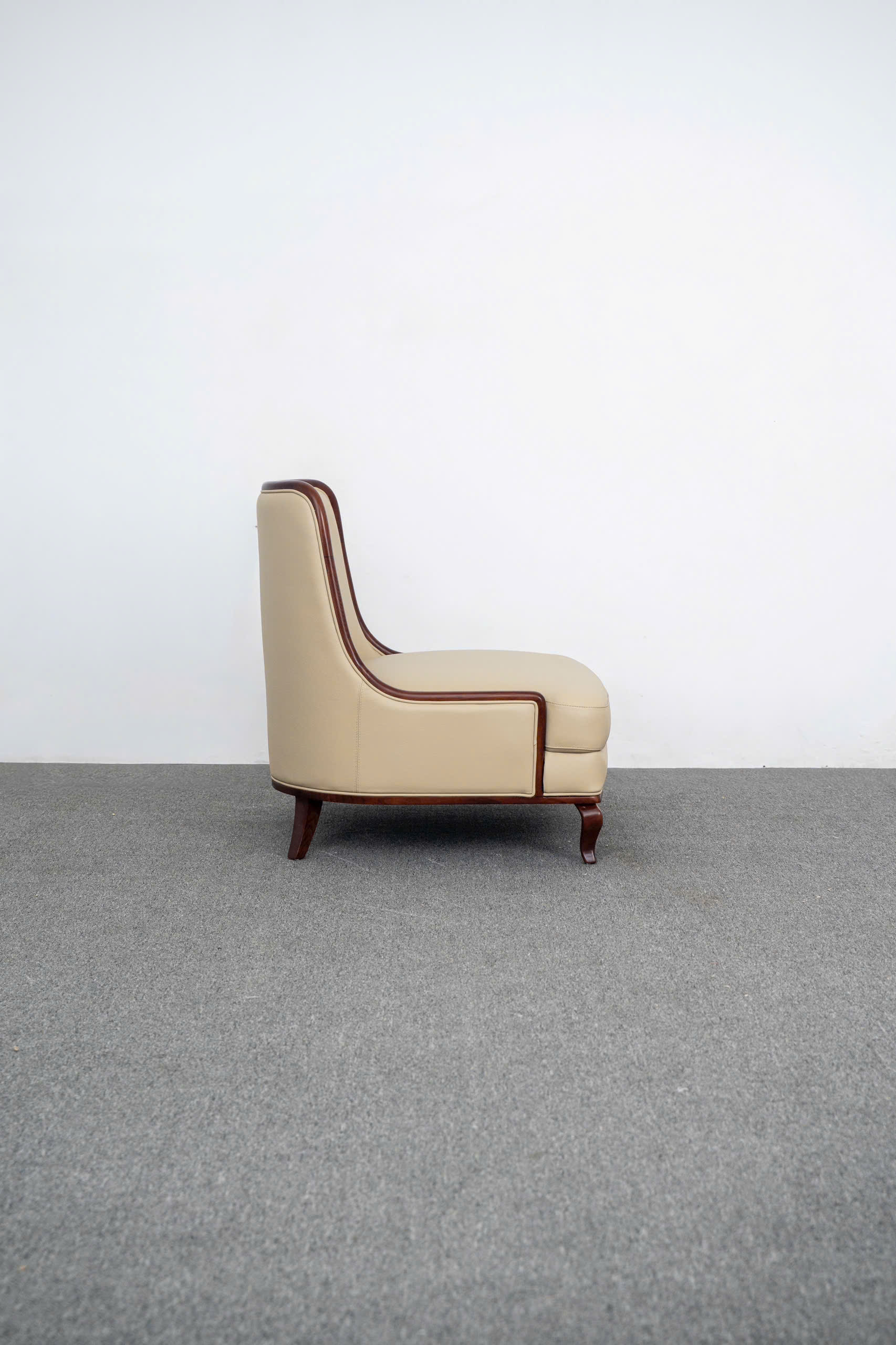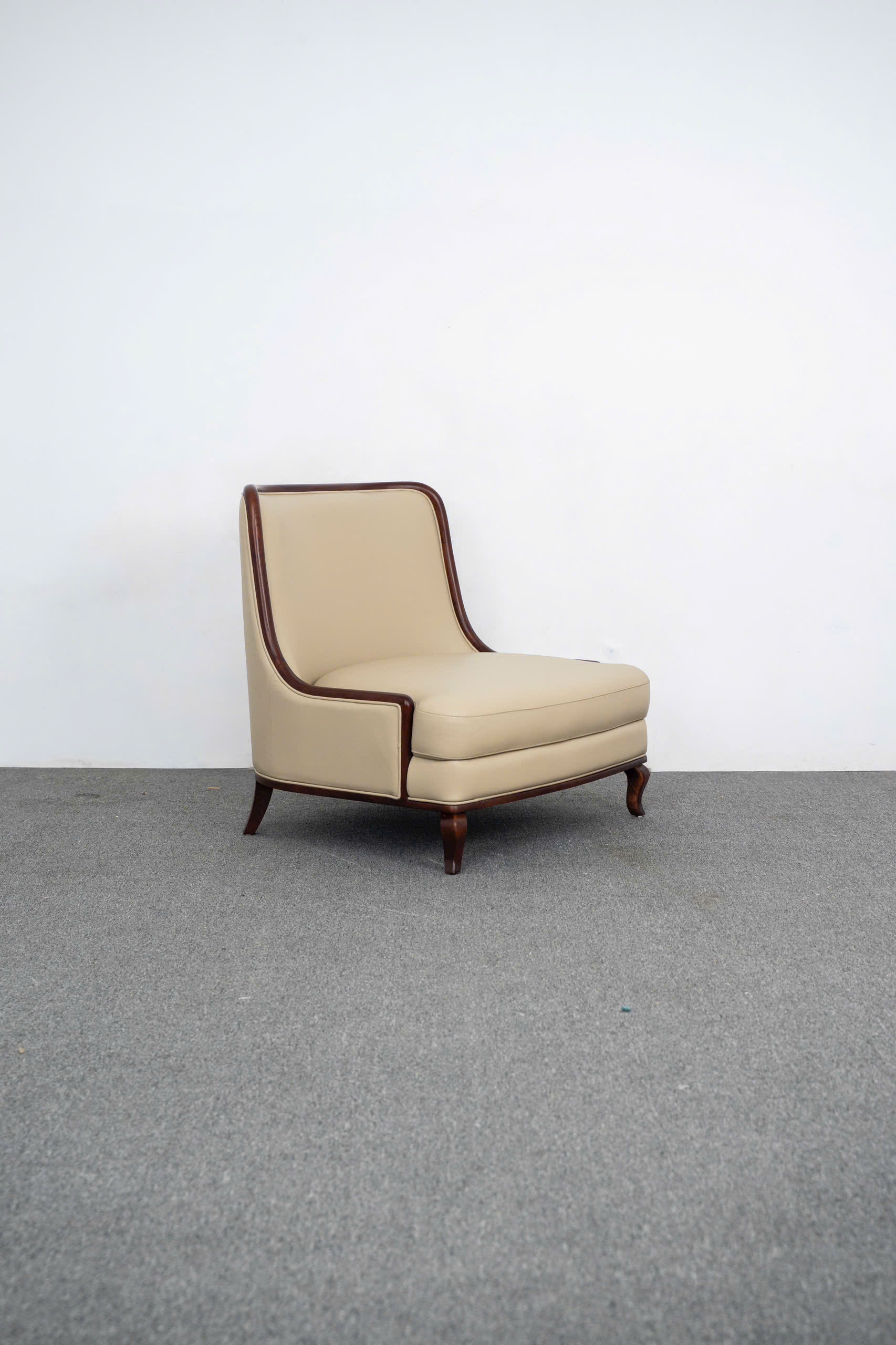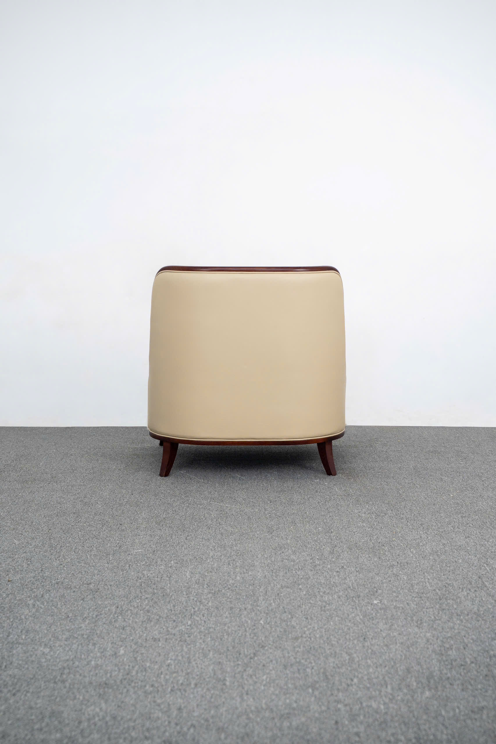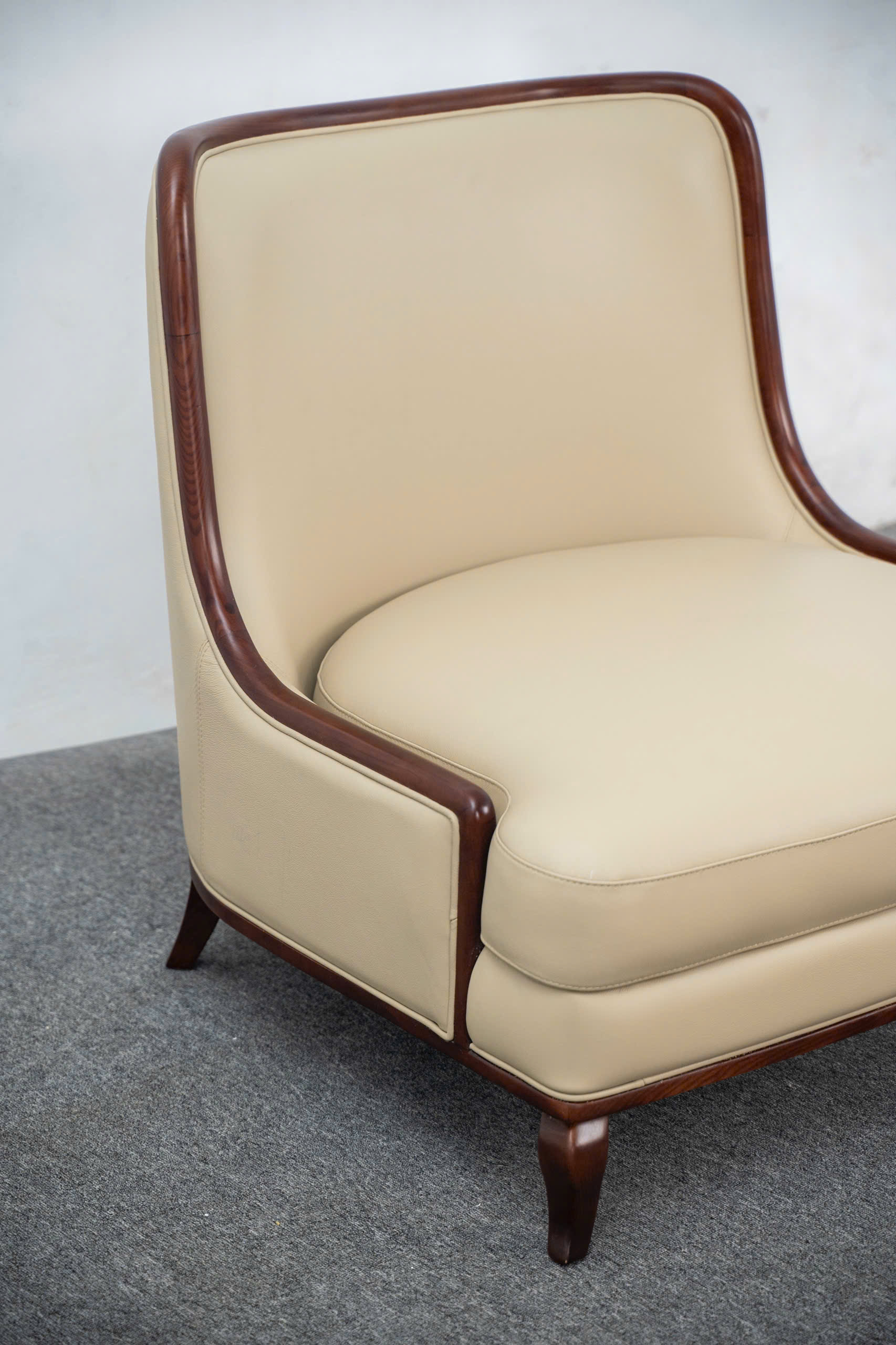 Sự tỉ mỉ được thể hiện rõ nét qua cách xử lý bề mặt gỗ: nhẵn mịn như lụa, không một vết gợn. Phần chân ghế được thiết kế với độ choãi nhẹ nhàng, không chỉ tạo sự ổn định về kết cấu mà còn tạo hiệu ứng thẩm mỹ thanh mảnh, giúp bộ ghế trông như đang "bay" trên mặt sàn. Sự kết hợp giữa tông màu kem sáng của da và sắc nâu sẫm quyền quý của gỗ tạo nên một sự tương phản đầy tính nghệ thuật, tôn vinh nét quyến rũ vượt thời gian của sản phẩm.