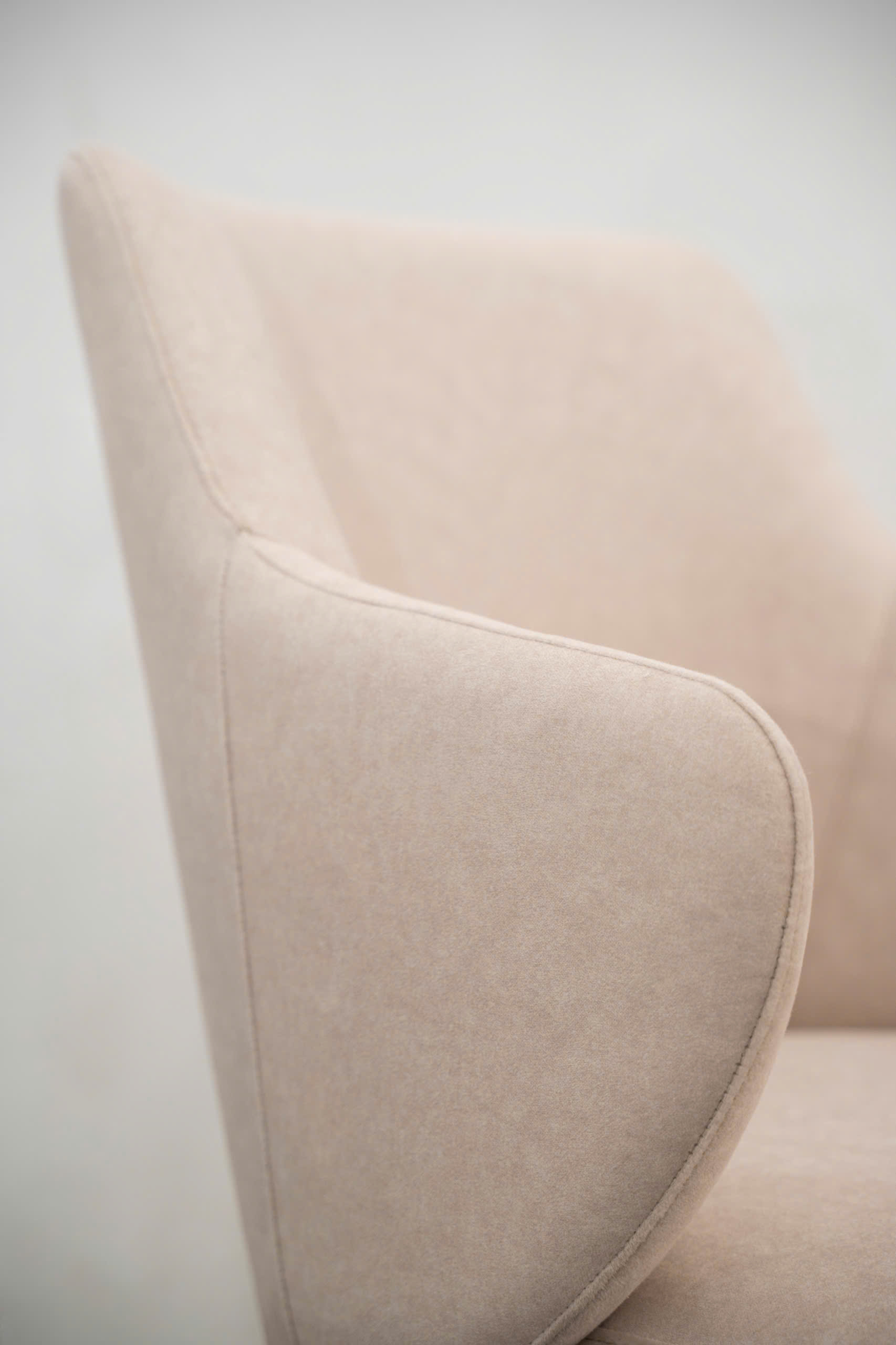 Phần tựa lưng và tay vịn được thiết kế liền mạch, vát cong tinh tế. Hiệu ứng thị giác này gợi liên tưởng đến những cánh hoa đang hé nở, nhẹ nhàng ôm trọn lấy cơ thể người ngồi. Thiết kế này không chỉ đẹp mà còn mang ý nghĩa về sự bảo vệ và thư giãn tuyệt đối.