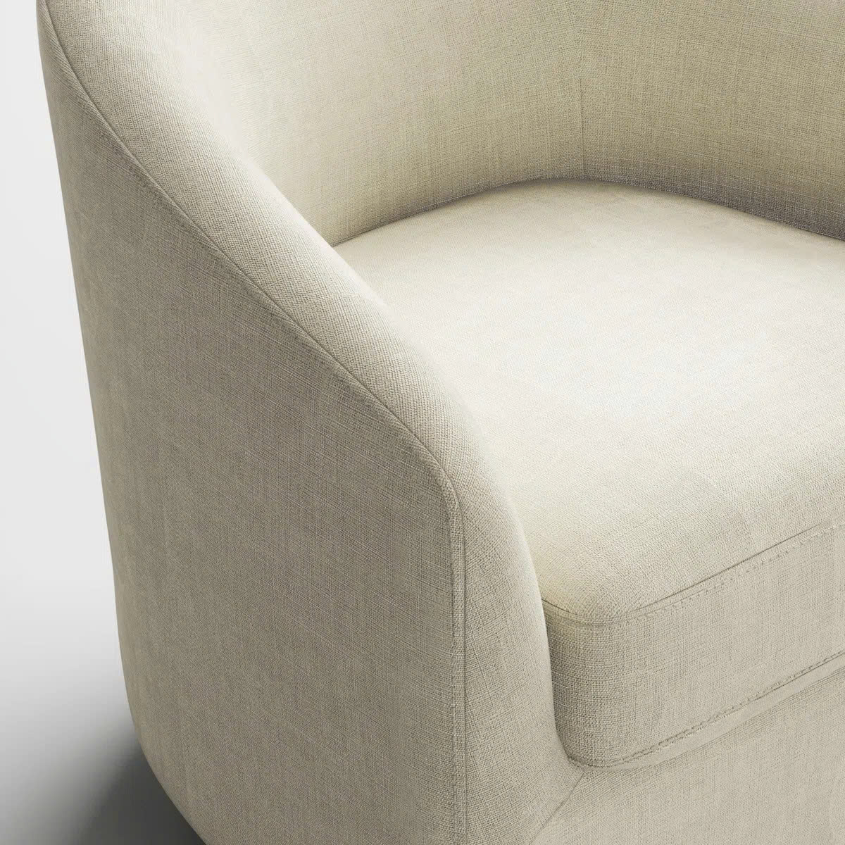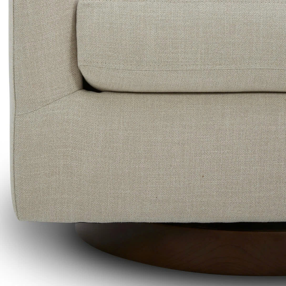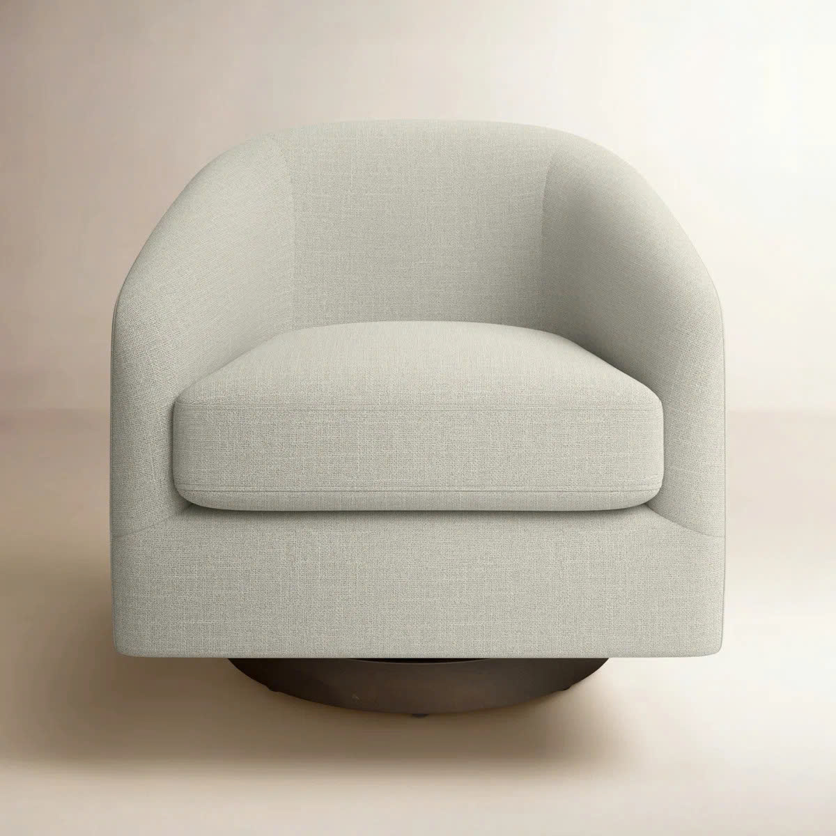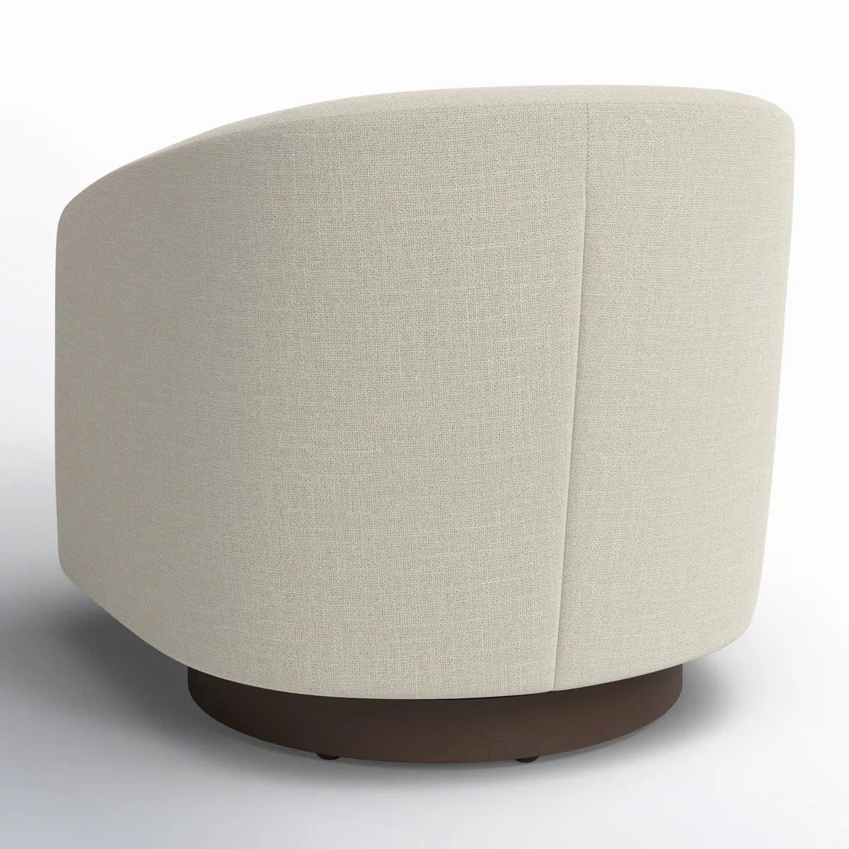 Đế kim loại cố định màu tối: Đế ghế được chế tác chắc chắn từ vật liệu cứng (thường là kim loại hoặc gỗ sơn tối màu), đóng vai trò là trụ cố định. Chi tiết này tạo nên độ tương phản thị giác mạnh mẽ, làm nổi bật thân ghế sáng màu và là yếu tố cân bằng, đảm bảo sự ổn định tuyệt đối cho chiếc ghế Barrel Armchair có dáng tròn.