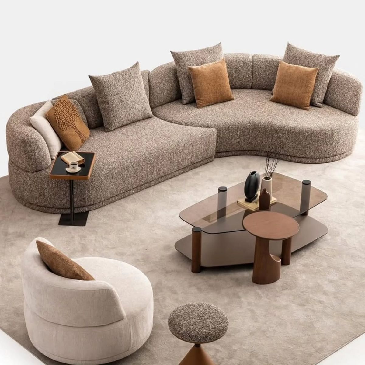 Thay vì các hình khối vuông vắn, cứng cáp, xu hướng 2026 là sofa module có đường cong, góc bo tròn mềm mại, tạo sự thân thiện, uyển chuyển và phá vỡ sự cứng nhắc thường thấy trong nội thất hiện đại.