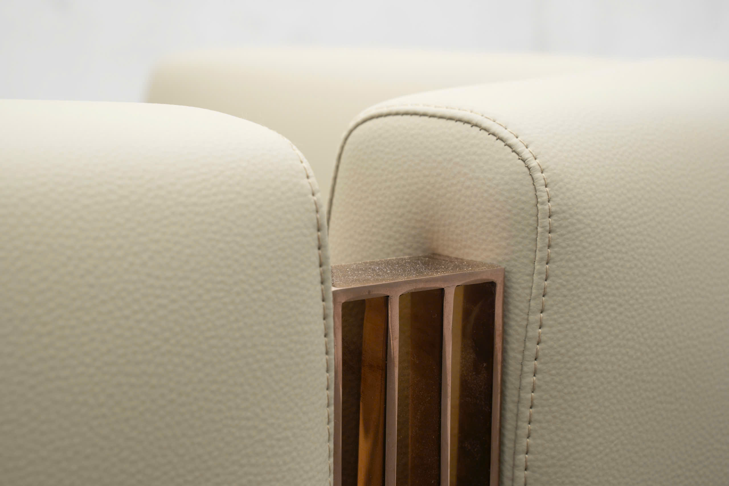 Điểm nhấn đắt giá nhất trên dòng sản phẩm này chính là các thanh nẹp kim loại mạ vàng đồng chạy dọc theo các khớp nối của thân ghế. Những dải kim loại này không chỉ đóng vai trò gia cố khung xương thêm phần kiên cố mà còn là "trang sức" giúp Soren tỏa sáng dưới ánh đèn trang trí. Khi ánh sáng chạm vào các đường nẹp kim loại, nó tạo nên những dải màu lấp lánh, nâng tầm đẳng cấp cho không gian sống và khẳng định giá trị thủ công cao cấp mà thương hiệu muốn gửi gắm vào từng sản phẩm.