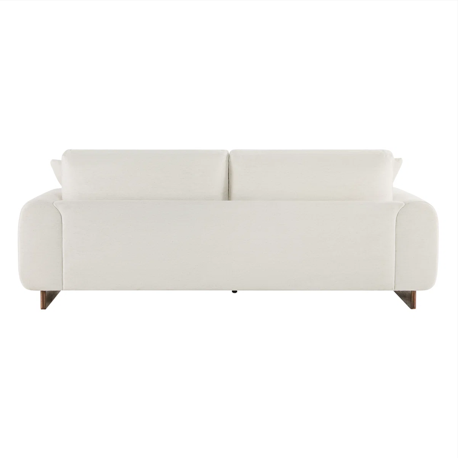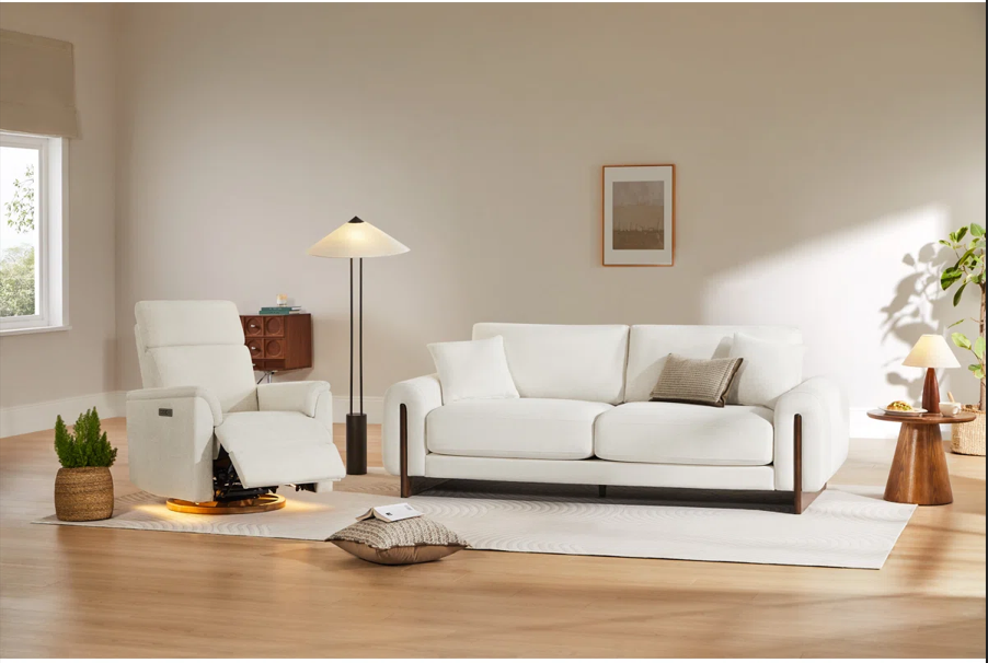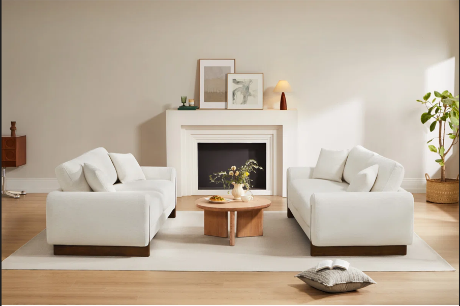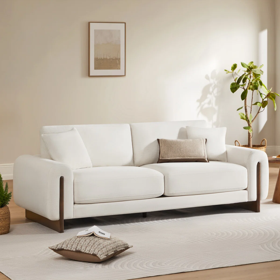 Lớp bọc màu trung tính sáng (Trắng Kem/Be) tạo cảm giác nhẹ nhàng, mở rộng không gian, là phông nền hoàn hảo cho sự tương phản của đế gỗ nâu đậm. Sự đối lập này tạo nên điểm nhấn sắc nét, ngăn sofa bị hòa lẫn vào tường và mang lại chiều sâu thị giác.