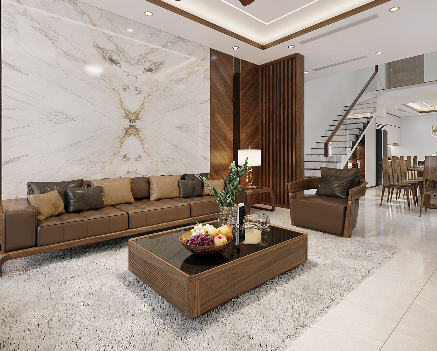 Màu nâu trầm của sofa tạo nên sự đối lập mạnh mẽ nhưng hài hòa với mảng tường ốp đá Marble trắng sáng hoặc tường sơn trung tính, mang lại cảm giác chiều sâu và sự thanh lịch tối đa cho không gian.