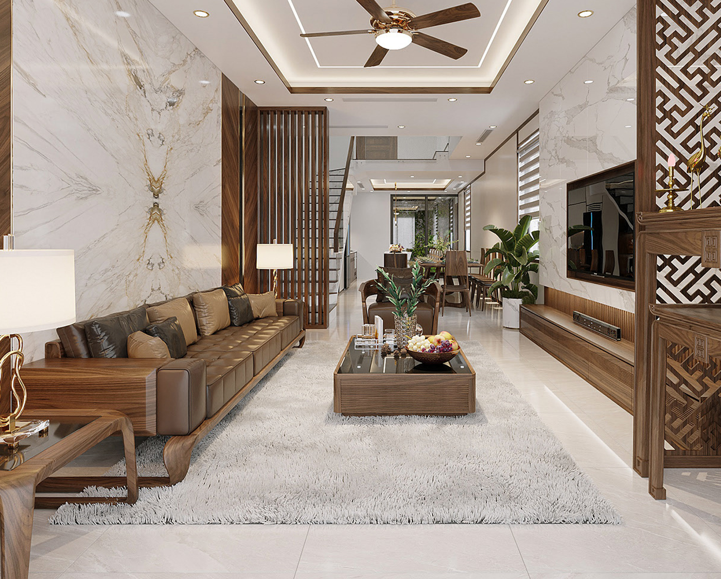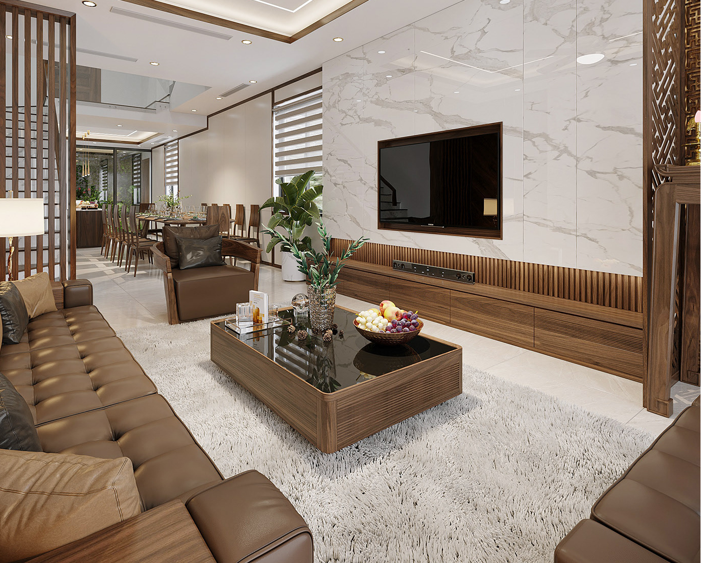 2. Phối cảnh nội thất phòng khách Quiet Luxury hoàn hảo