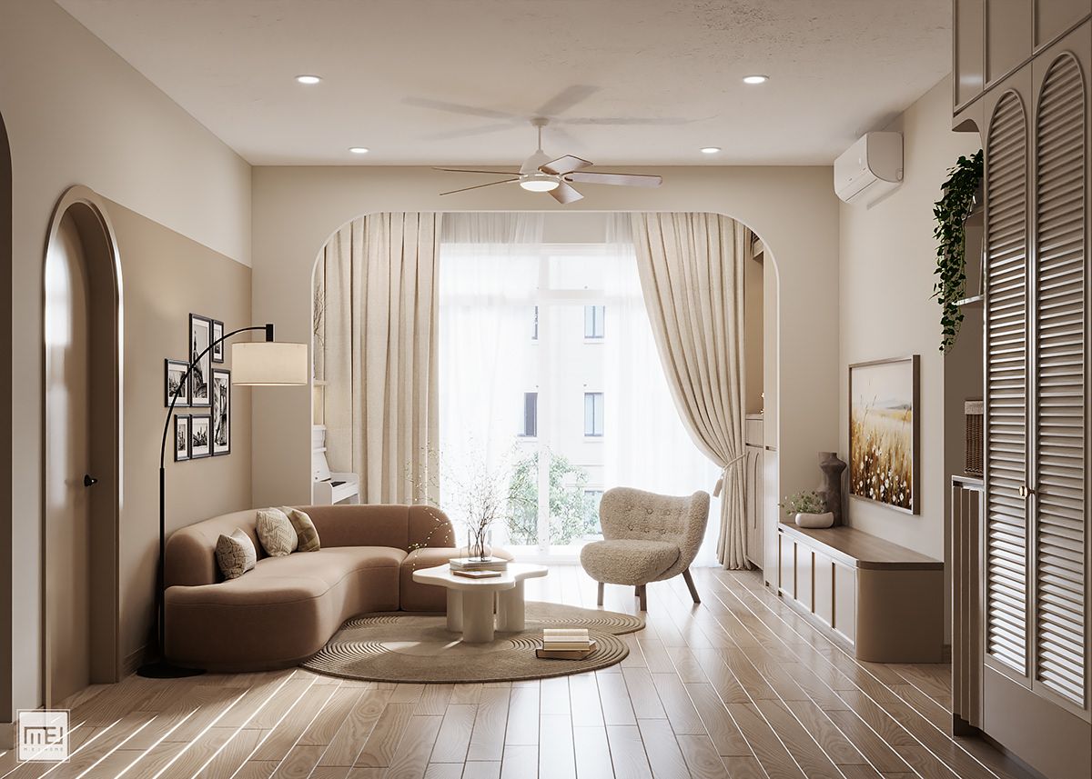 Điểm chạm đầu tiên và cũng là quan trọng nhất định hình nên linh hồn của phong cách Hàn Quốc chính là hệ thống bảng màu trung tính được duy trì xuyên suốt không gian. Các tông màu như trắng kem, be sáng, ghi nhạt hay màu gỗ tự nhiên không chỉ đơn thuần là sự lựa chọn ngẫu nhiên, mà chúng được ưu tiên dựa trên khả năng phản chiếu ánh sáng tuyệt vời. Trong bối cảnh các căn hộ chung cư đô thị hiện đại thường có diện tích hạn chế, việc sử dụng các tông màu sáng này tạo ra một hiệu ứng thị giác "mở rộng", giúp xóa nhòa ranh giới giữa các bức tường, khiến phòng khách trở nên thoáng đãng, rộng rãi và tràn đầy sinh khí hơn rất nhiều.
