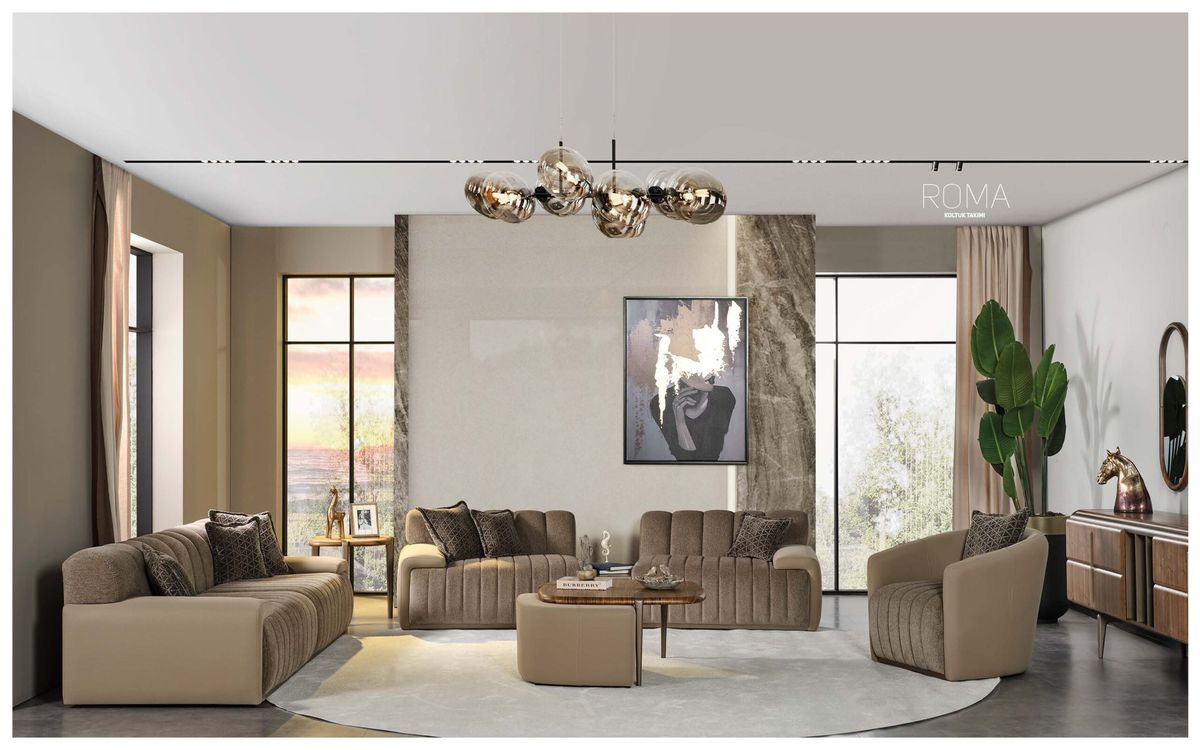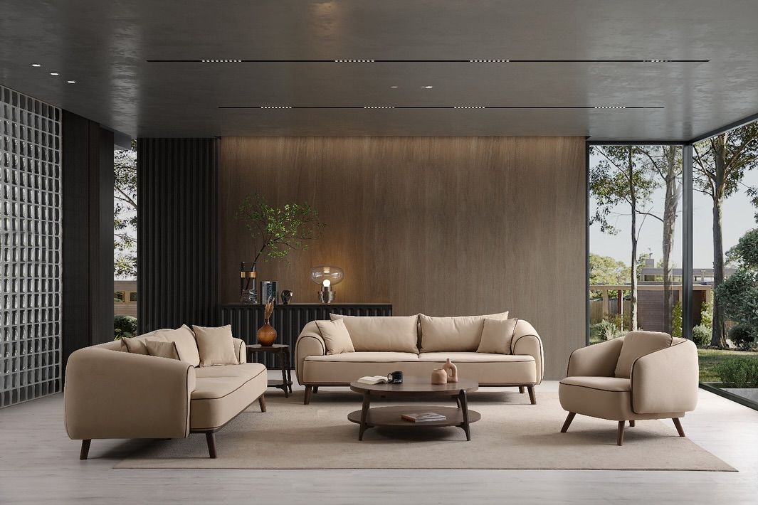Trong một phòng khách tối giản, bộ sofa thường là món đồ nội thất chiếm diện tích lớn nhất. Một bộ sofa da hoặc nỉ màu Universal Khaki sẽ tạo ra sự đồng nhất tuyệt vời với không gian.