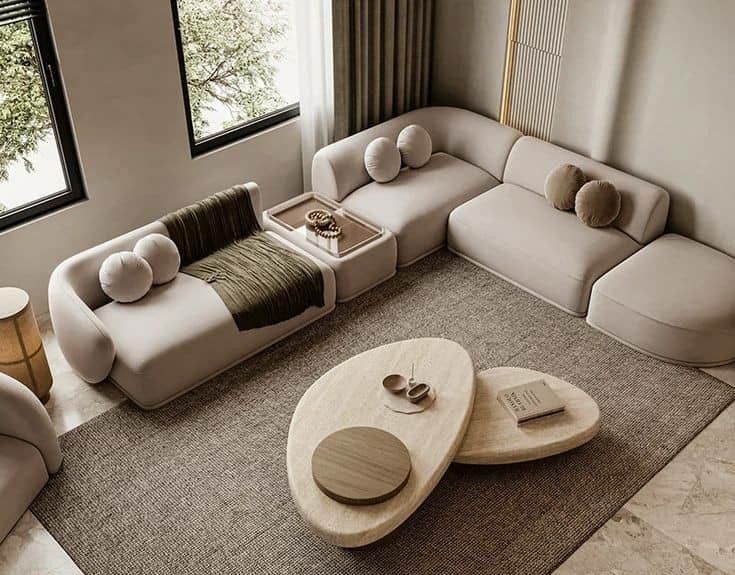 - Vải dệt và thảm: Một chiếc thảm bằng sợi tự nhiên hoặc một vài chiếc gối tựa lưng bằng vải nỉ có bề mặt thô nhám sẽ tạo ra sự tương phản về xúc giác. Chính những chi tiết này khiến bộ sofa trở nên mời gọi và muốn được tựa lưng ngay lập tức.
